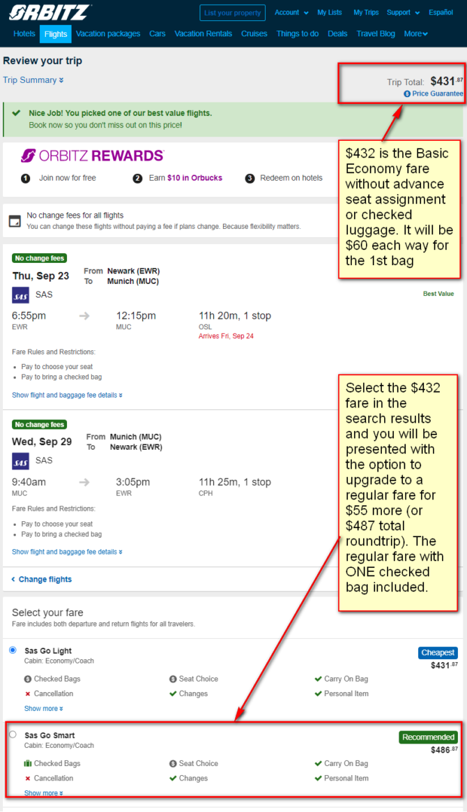 - Select the $432 fare in the search results, you’ll be presented with the option to upgrade to a regular fare for $55 more (or $487 total roundtrip). The regular fare with ONE checked bag included.