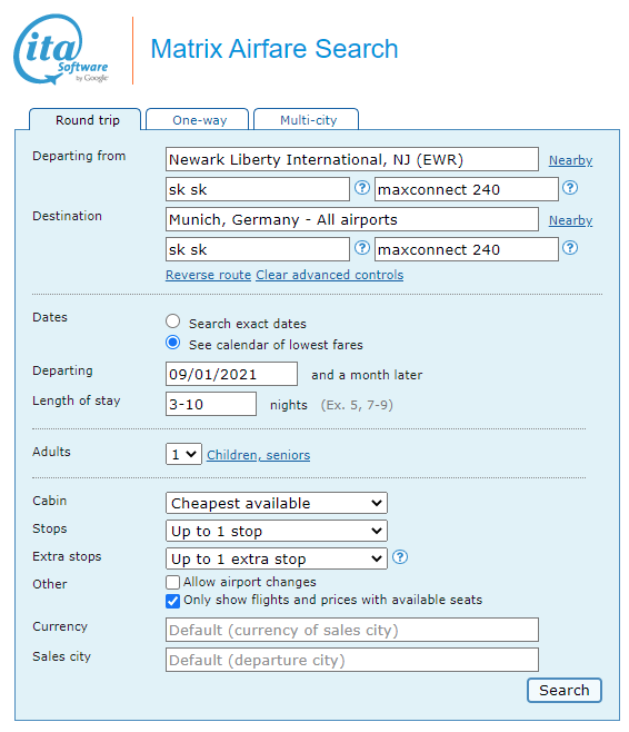 - Use ITA Software Matrix Airfare Search and use the following search criteria: