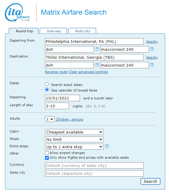 - Support us by using our Qatar Airways link to book with dates found on ITA Software Matrix Airfare Search.