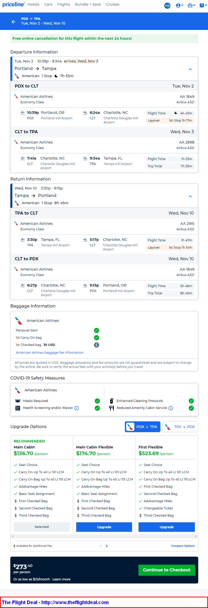 • PDX – CLT (Charlotte) – TPA (Tampa) – CLT – PDX