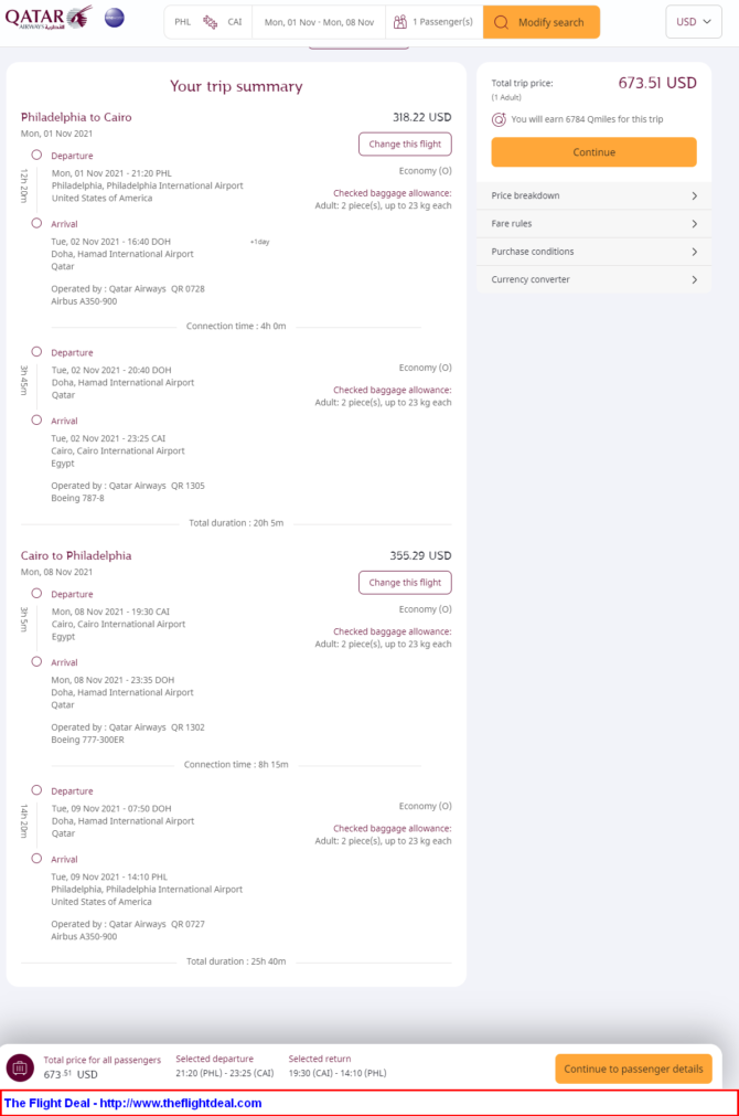 - PHL – DOH (Doha) – CAI (Cairo) – DOH – PHL