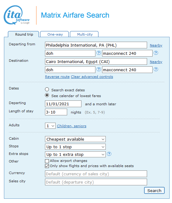 - Support us and book on Qatar Airways with dates found on ITA Software Matrix Airfare Search.