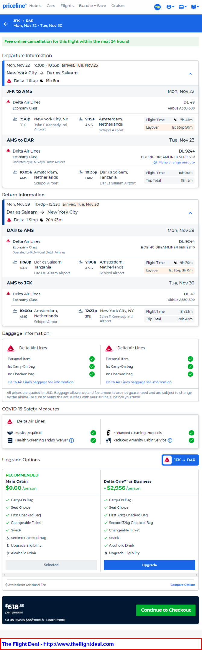 JFK – AMS (Amsterdam) – JRO (Kilimanjaro) – DAR (Dar es Salaam) – AMS – JFK