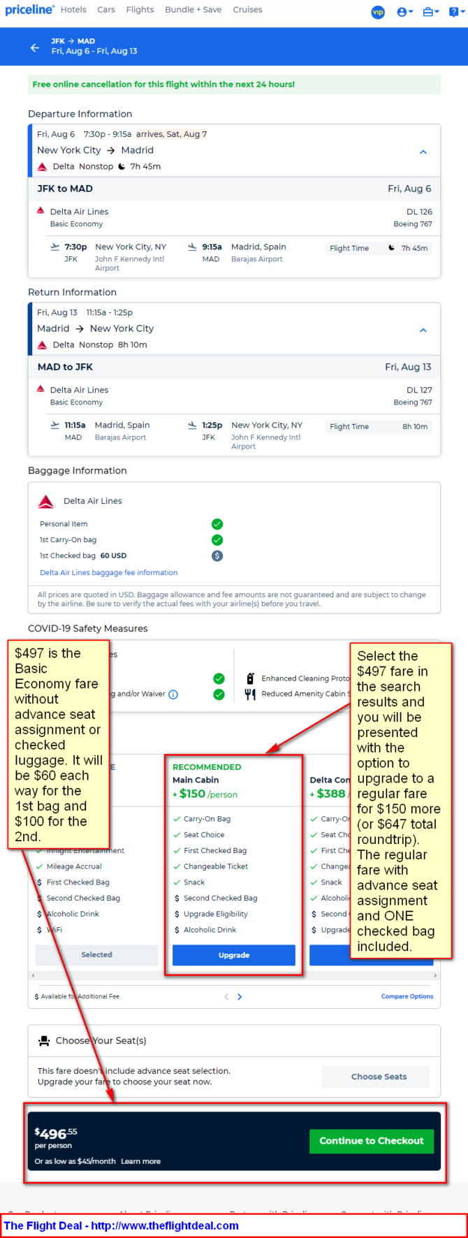 Select the $497 fare in the search results and you will be presented with the option to upgrade to a regular fare for $150 more (or $647 total roundtrip). The regular fare with advance seat assignment and ONE checked bag included.