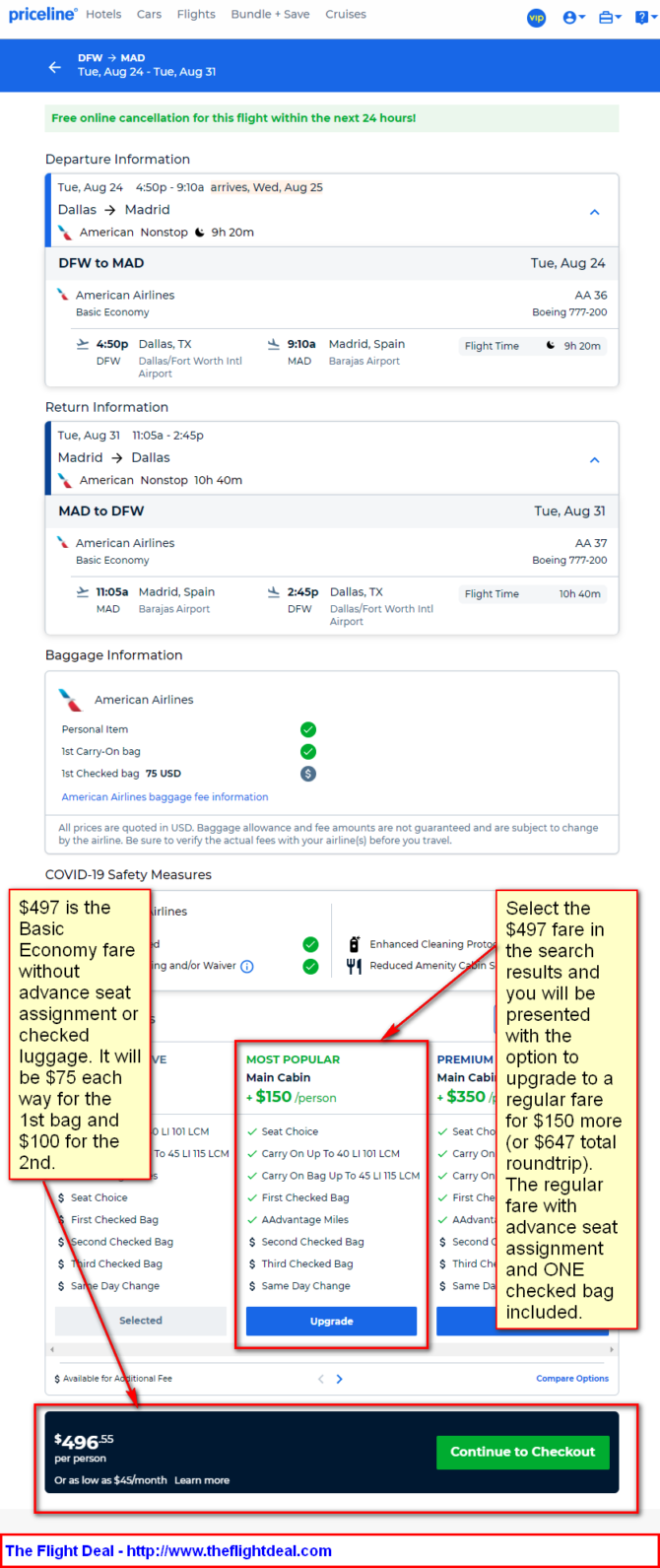 • Select the $497 fare in the search results and you will be presented with the option to upgrade to a regular fare for $150 more (or $647 total roundtrip). The regular fare with advance seat assignment and ONE checked bag included.