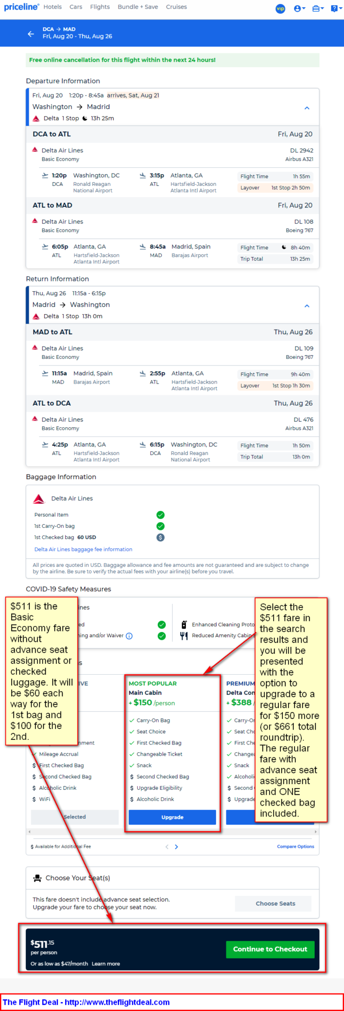 Select the $506 fare in the search results and you will be presented with the option to upgrade to a regular fare for $150 more (or $656 total roundtrip). The regular fare with advance seat assignment and ONE checked bag included.
