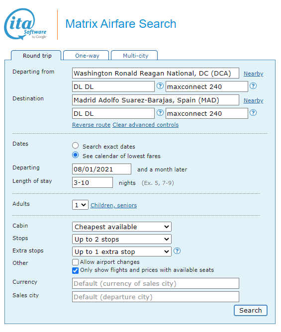 DCA – ATL (Atlanta) – MAD (Madrid) – ATL – DCA