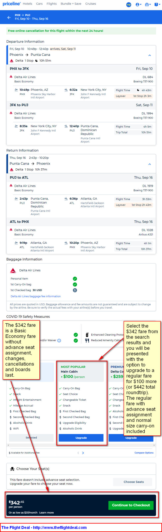 Select the $342 fare from the search results and you will be presented with the option to upgrade to a regular fare for $100 more (or $442 total roundtrip). The regular fare with advance seat assignment and normal size carry-on included