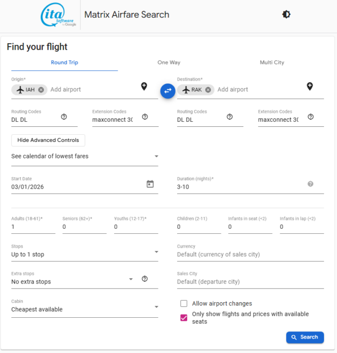 - The Matrix Airfare Search by ITA Software search page should be like below when all values are inputted