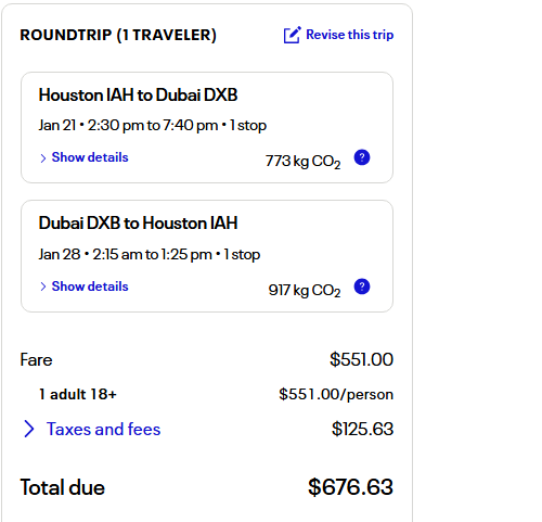- IAH – EWR (Newark) – DXB (Dubai) – EWR – IAH