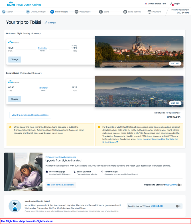 - PDX – AMS (Amsterdam) – TBS (Tbilisi) – AMS – PDX