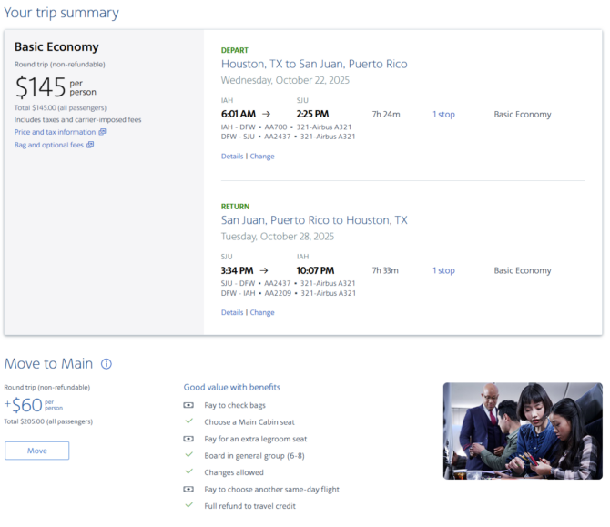 American: Houston – San Juan, Puerto Rico. $145 (Basic Economy) / $205 (Regular Economy). Roundtrip, including all Taxes