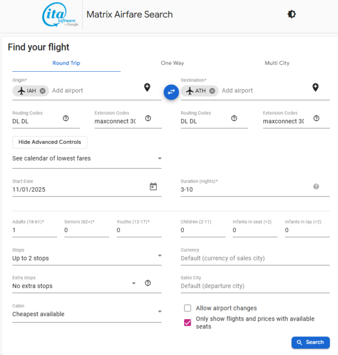 • The Matrix Airfare Search by ITA Software search page should be like below when all values are inputted