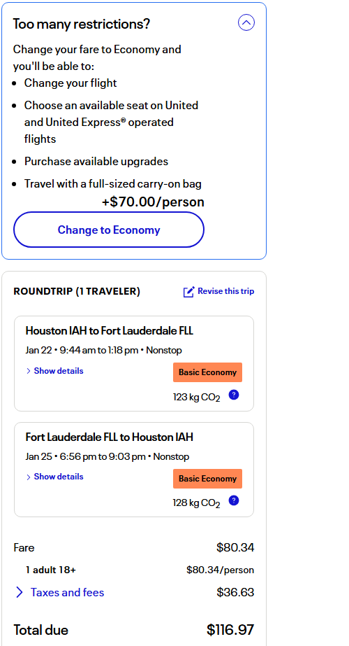 United: Houston – Fort Lauderdale (and vice versa). $117 (Basic Economy) / $187 (Regular Economy). Roundtrip, including all Taxes