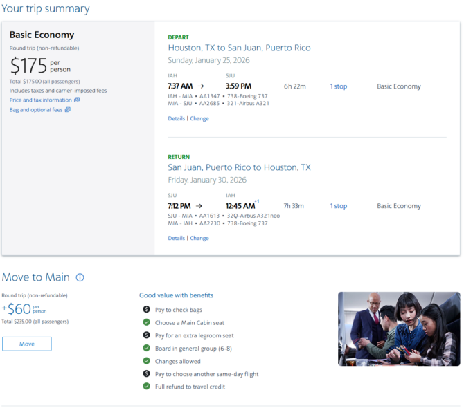 American: Houston – San Juan, Puerto Rico. $175 (Basic Economy) / $235 (Regular Economy). Roundtrip, including all Taxes
